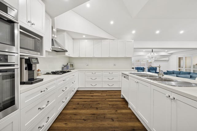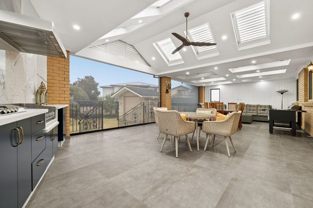 The home's expansive layout offers multiple elegant living zones and a bespoke kitchen with premium appliances. An entertainer's dream, the enormous alfresco is finished to perfection - complete with a full outdoor kitchen, sunlight-controlling aluminium plantation shutters, and remote-controlled privacy weather screens. This is all framed by manicured stone garden beds and stylish fencing, offering both beauty and low-maintenance appeal.